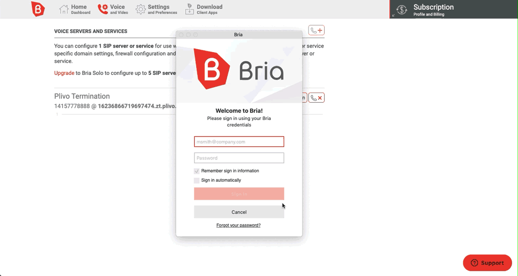 - Log in to the Bria account using the same email address and password you used to create the Bria Solo account.
