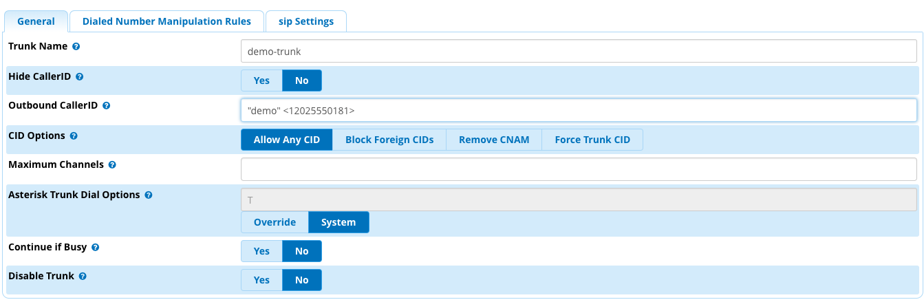 - Trunk Name: A friendly name for the trunk (for example, demo-trunk)