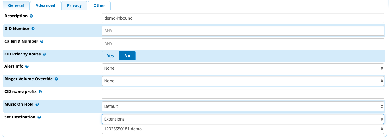 - DID Number - Define the expected DID Number if your trunk passes DID on incoming calls or leave it blank to match calls with any or no DID info.