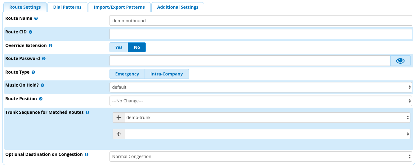 - Once you have entered your dial pattern, click Submit. The outbound route will be configured to your trunk. You must now configure an extension.