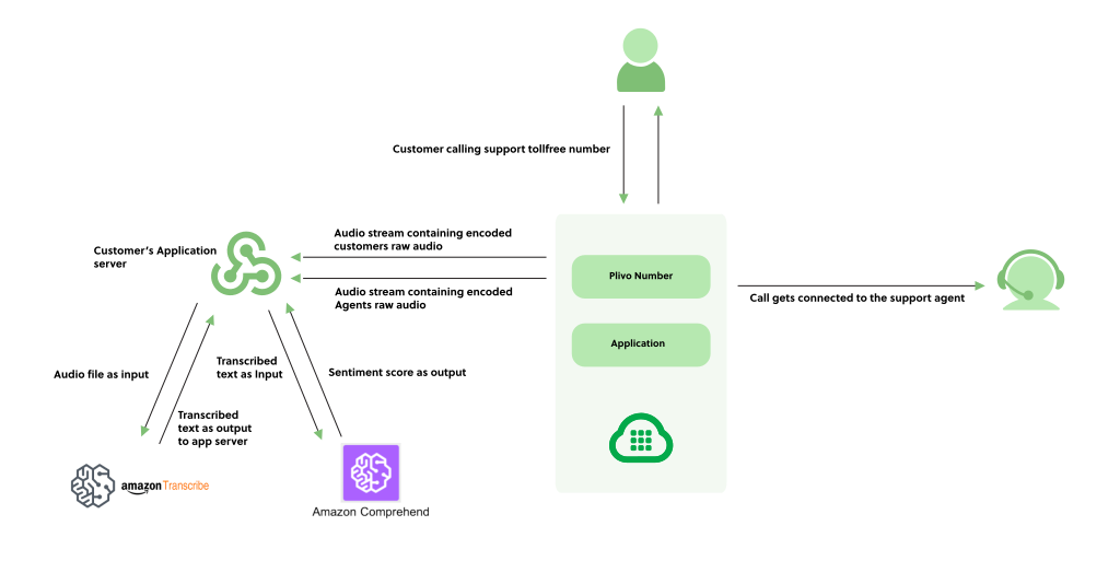 High-quality customer interactions are crucial for maintaining the service standard that gives your business a competitive advantage. Today, Plivo is making it easier than ever to maintain that standard with an application that analyzes call quality using Plivo’s audio stream, paired with various AI-driven transcription and sentiment analysis services. To illustrate, Amazon Transcribe and Amazon Comprehend integrate easily with Plivo’s Voice API. Any AI service for transcription and sentiment analysis could work, but we’ll use these popular products to demonstrate how the API works. If you’re unfamiliar with these two Amazon products, here’s a quick primer:- Amazon Transcribe is an automatic speech recognition service that uses machine learning models to convert audio to text.
