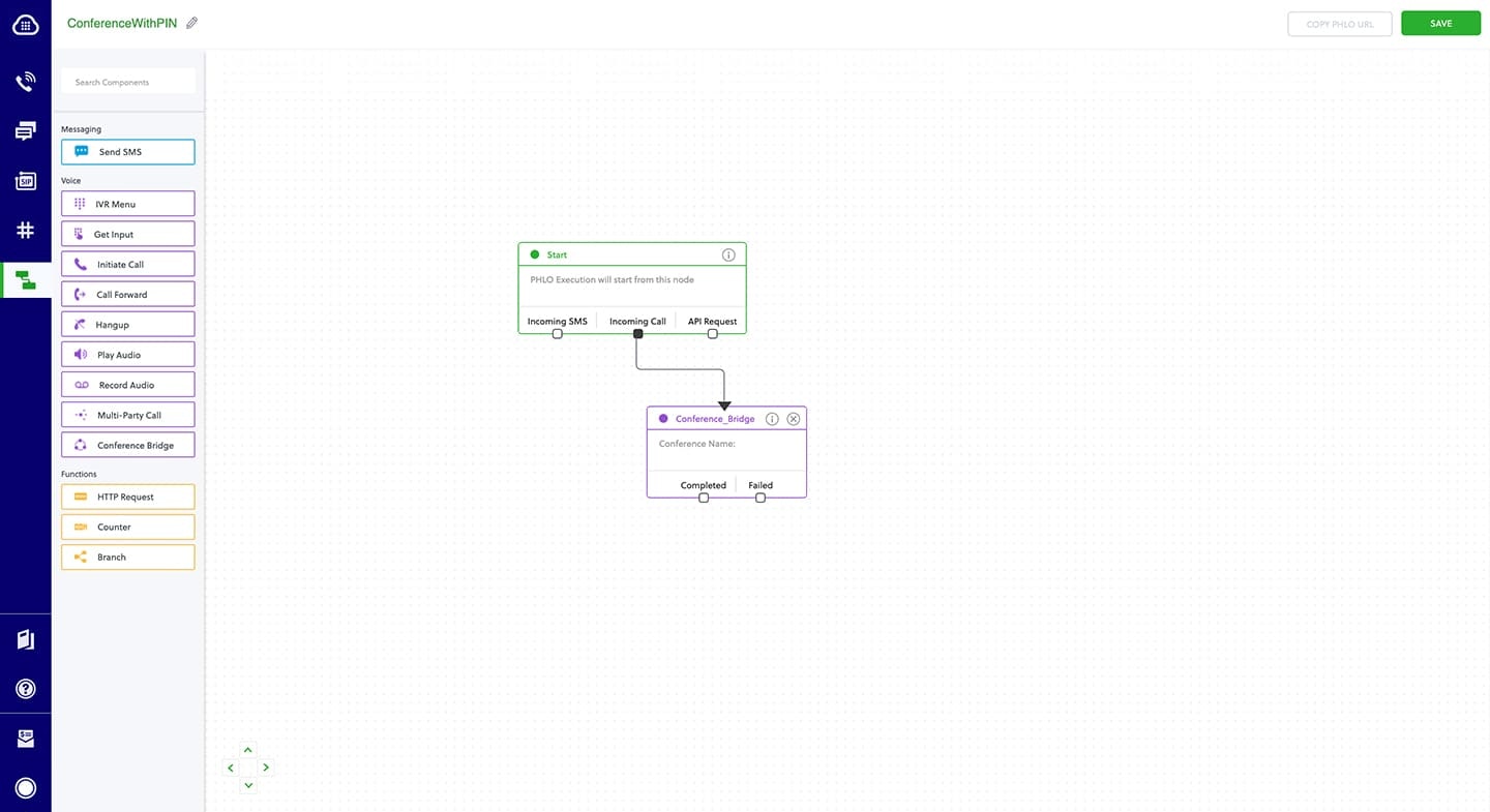 You can create and deploy a workflow to implement conference calling with a PIN with a few clicks on the PHLO canvas.