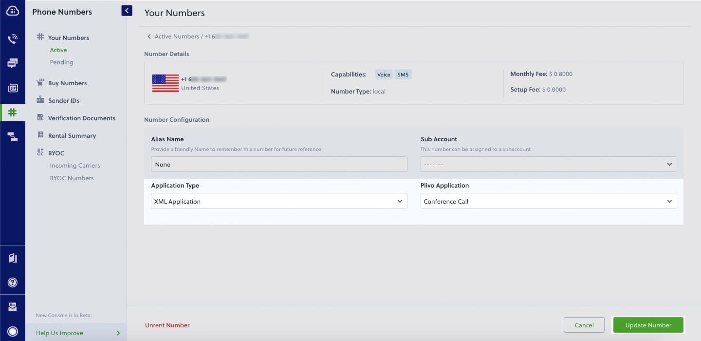 Navigate to the Numbers page and select the phone number you want to use for this application.From the Application Type drop-down, selectXML Application.From the Plivo Application drop-down, select Conference Call (the name we gave the application).Click Update Number to save.