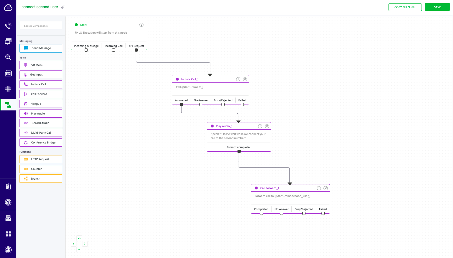You can create and deploy a PHLO to have an application call someone then connect them to a third party, and you can trigger the PHLO with a few lines of code.To create a PHLO, visit the PHLO page of the Plivo console. If this is your first PHLO, the PHLO page will be empty.