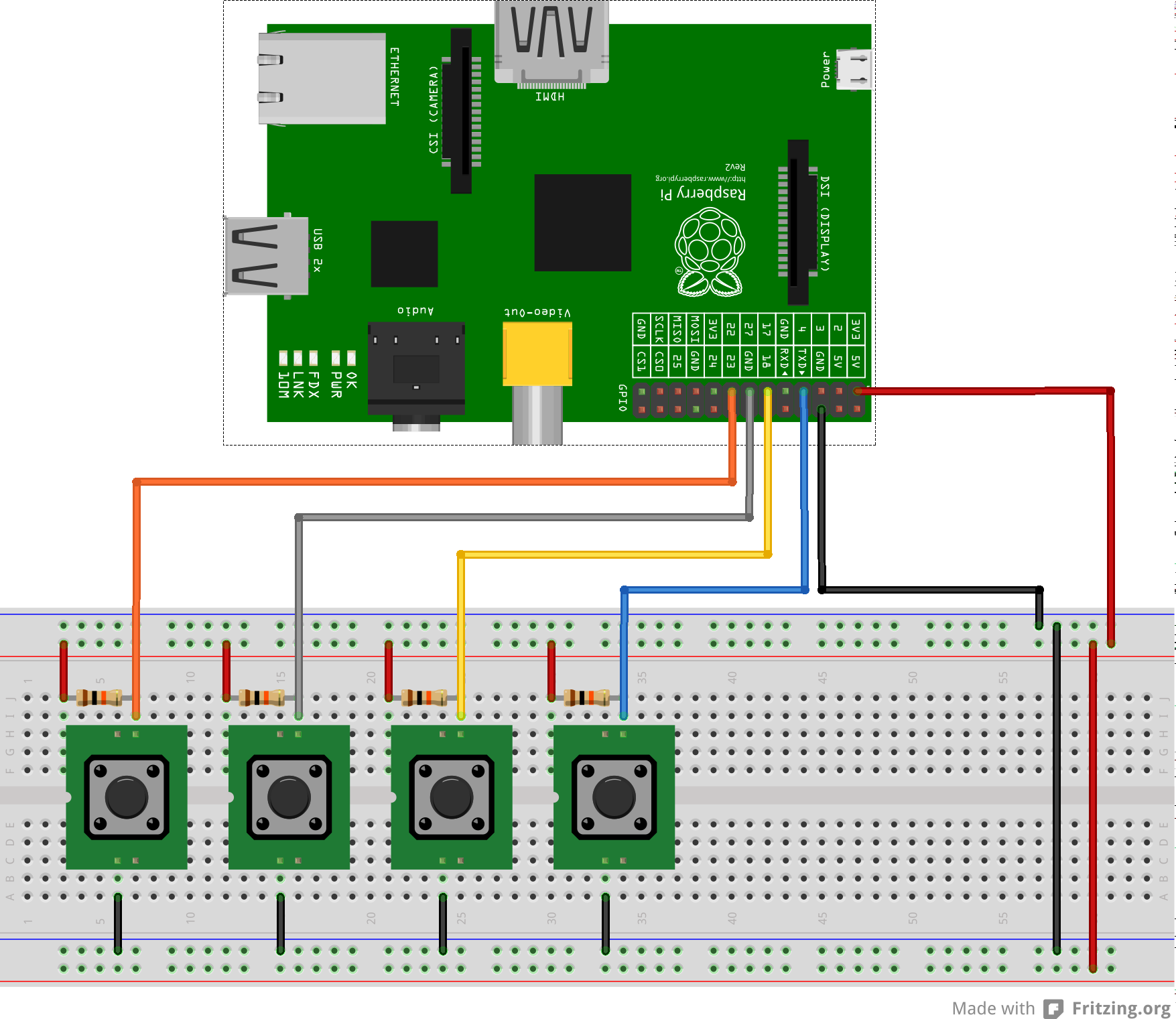 I hooked up a four-button keypad to four of the Raspberry Pi GPIO pins as inputs, then run a continuous loop to check whether the buttons have been pushed. Circuit diagram #1