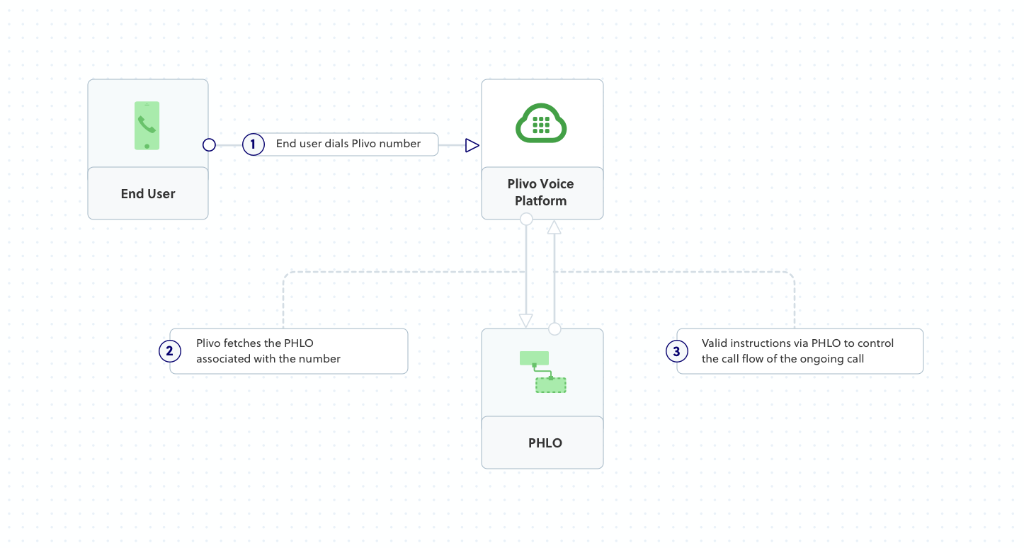 When you receive a call on a voice-enabled Plivo number, you can control the call flow by associating a PHLO application to that Plivo number. Plivo will fetch the PHLO associated with the number and expect valid instructions via PHLO to handle the call.